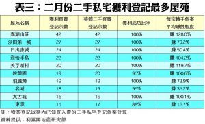 此外,環顧上月10個獲利登記最多的屋苑,當中大部分都能錄得百分百獲利,而每宗平均賺幅則介乎16.7%至128.0%不等。值得注意的是,剛脫離SSD辣招三年禁售期不久的東環打入十大獲利登記宗數最多的屋苑,上月共錄得15宗轉手獲利個案,獲利成功比率達88%,而其每宗轉手個案平均賺幅為16.7%,與過去約三年樓價累積的17.4%升幅相若,反映了市場實況。至於上月獲利登記宗數最多及平均賺幅最大的屋苑均為嘉湖山莊,分別是42宗及平均賺128.0% (見表三)。