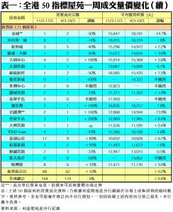 至於,新界區21個指標屋苑上周累錄68宗買賣,按周增加10%,其中碧堤半島錄得3宗成交,較前周的1宗增加2倍;大埔中心、灝景灣及珀麗灣各錄4宗、2宗及2宗交投,按周增幅分別有1倍;嘉湖山莊及柏慧豪園上周分別錄得17宗及3宗買賣,按周各自增加89%及50%。另外,在全港50個指標屋苑當中,上周共有6個屋苑錄得「零成交」,較前周的4個增加50%,當中九龍及新界區各佔4個及2個,港島區則全線均能錄得交投(詳見表一)。