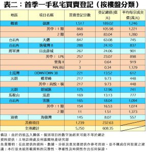 按樓盤分類,今年首季應市新盤中,以九龍區新盤表現最突出,當中觀塘「凱匯」成為最熱賣的單一新盤,1期及2期合共錄得1,517宗登記,涉及登記總值189.02億元,平均每宗成交價約1,246萬元。其次是新界區白石角的「天鑽」,共錄847宗買賣登記,涉資63.08億元,每宗均價約745萬元。此外,在首季的十大熱賣新盤當中,平均每宗成交價最高者為白石角「雲匯2期」,期內錄得11宗登記,平均每宗涉資約1,373萬元,而較低平均價者則為元朗「尚悅‧嶺」的約448萬元(見表二)。