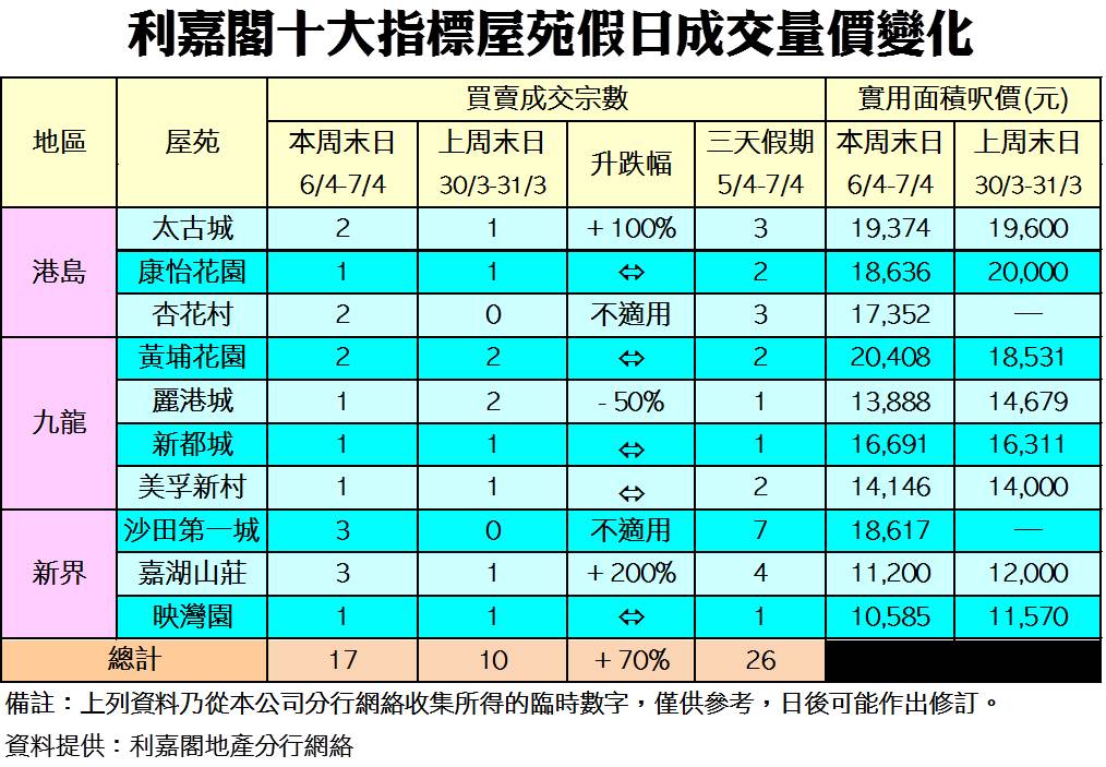 《利嘉閣十大指標屋苑假日二手實況》 樓價「報復式」反彈 二手交投氣氛活躍 十大屋苑周末錄17宗買賣 三天交投26宗 研究報告 2019-04-07 by Chan Derek · Published 2019-04-07