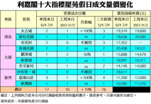 《利嘉閣十大指標屋苑假日二手實況》 樓價「報復式」反彈 二手交投氣氛活躍 十大屋苑周末錄17宗買賣 三天交投26宗