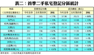 按地區分析,從買賣交投量最活躍的十個地區觀察,全數地區按季均錄得升幅,當中以筲箕灣/柴灣區二手私宅登記量升勢最顯著,季內共錄得224宗登記,較對上一季大升1倍;而荃灣區登記量亦錄得82%的升幅,共有357宗。至於登記量最活躍者為將軍澳區,首季共錄469宗買賣登記,並較去年第四季的265宗大升77%。