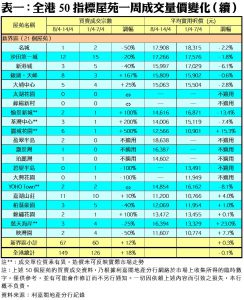 至於,新界區21個指標屋苑上周共錄67宗買賣,較前周的60宗增加12%,其中麗城花園交投大增5倍,共錄得6宗買賣;荃灣中心及銀湖‧天峰各自錄3宗及8宗成交,分別按周大升2倍及近1.7倍;至於上周交投量最旺的是沙田第一城的12宗,其次是嘉湖山莊的11宗。另外,在全港50個指標屋苑當中,上周共有10個屋苑錄得「零成交」,較前周的9個微增1個,當中九龍及新界區同樣佔4個,港島區則佔2個(詳見表一)。