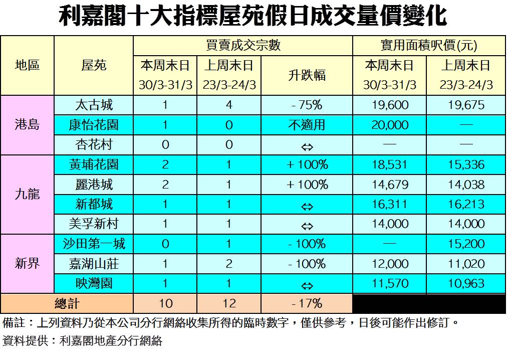 《利嘉閣十大指標屋苑假日二手實況》 新盤吸客力強 二手反價現缺盤 十大屋苑錄10宗買賣 按周回落17% 研究報告 2019-04-01 by Chan Derek · Published 2019-04-01