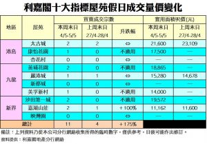 《利嘉閣十大指標屋苑假日二手實況》 一手熾熱氣氛帶動 周末二手成交反彈 十大屋苑周末錄11宗買賣 按周上升1.75倍