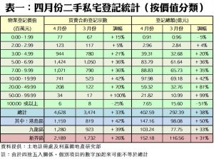 今年四月份,按二手私宅價值分類,9個價格組別的買賣登記量錄得八升一跌,當中以5,000萬至1億元以內價格組別,在低基數下錄得1倍的升幅最顯著,由三月的17宗倍增至上月的34宗。其次,登記量升幅次大者為介乎2,000萬至5,000萬元以內的組別,上月共有208宗登記,按月升70%;而1,000萬至2,000萬元以內者亦升42%,至741宗。至於佔比最多的500萬至700萬元以內組別亦升36%,上月共錄得1,424宗登記。