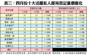 按全港三區作分析,四月份港九新界三區登記量全線上升。當中,以港島區升幅最顯著,月內共錄1,159宗登記,按月升42%。九龍區亦錄得39%的升幅,由前月的923宗增至1,280宗;而宗數最多的新界區也有26%的升幅,共錄得2,189宗登記。另外,十大最活躍成交分區登記量全線錄得升幅,當中以長沙灣/深水埗區的升幅最大,月內錄166宗登記,按月升69%;而將軍澳繼續成為買賣登記最旺的分區,上月共有266宗,按月亦升29%,其次為元朗區的247宗,按月升35%。