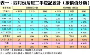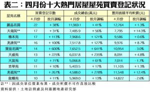 如按屋苑細分(見表二),九龍灣麗晶花園成交按月增加38%至22宗登記,期內成交總值近1.20億元,按月上升41%,並成為最熱賣屋苑首位。而次席則為天水圍天頌苑及沙田穗禾苑,同樣錄得17宗成交,按月分別增加31%及113%;成交總值分別為7,485.9萬及7,968.6萬元,較三月份分別增加56%及121%。
