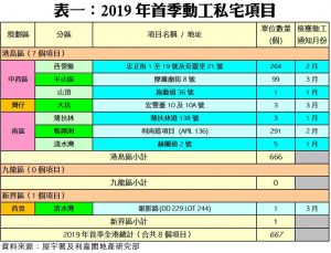 連同上述項目,2019年首季全港共有8個私宅項目動工,涉及單位總數667伙。當中以港島區的施工伙數最多,涉及7個項目共666伙,單位佔整體比例近99.9%;九龍區期內則暫未有私宅項目動工;而新界區有1個項目、涉及1個單位動工,佔整體比例僅逾0.1%。
