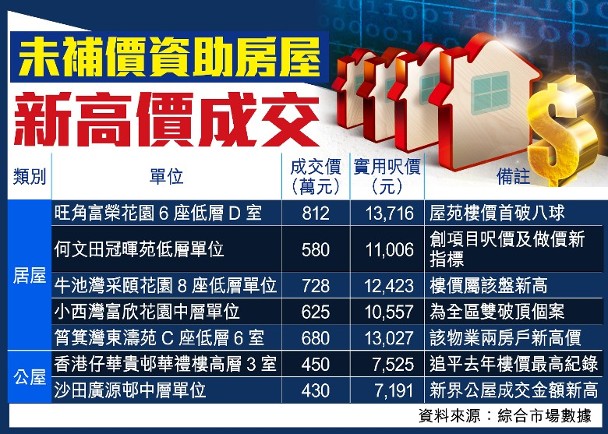 除居屋以外,未補價公屋樓價同樣急升。市場消息透露,香港仔華貴邨華禮樓高層單位,剛以450萬元易手,追平去年最高成交金額紀錄,亦是同類市場公屋次高,以實用面積598方呎計,呎價約7,525元。代理亦稱,由於同類大單位放盤罕有,才獲買家高價入市。