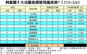 利嘉閣地產董事陳大偉表示,觀望氣氛持續籠罩市場,買家入市步伐相當緩慢,二手交投表現受壓。綜合利嘉閣地產分行數據所得,全港十大活躍指標屋苑在上周(27/5–2/6)錄得26宗買賣個案,較前周(20/5–26/5)的34宗按周減少24%。