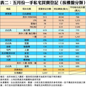 按樓盤分類,海日灣II上月共錄得596宗登記,成為五月份登記量最多的一手私宅項目,涉及登記總值44.79億元,平均每宗登記約751萬元;而次名則有MONTARA的513宗登記,第三位是瑧樺的206宗。至於登記排行榜內上月平均每宗買賣成交價最高者為MALIBU的約1,549萬元,而較低平均價者則為弦海的約452萬元。