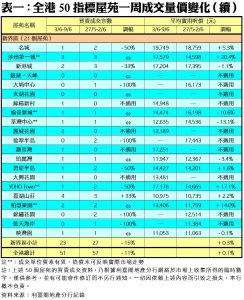 至於,九龍區21個指標屋苑上周共錄20宗交投,按周增加5%或1宗,其中黃埔花園錄得3宗成交,較前周的1宗增加2倍;美孚新村交投量亦由前周的1宗,增加1倍至上周的2宗;不過,海逸豪園則僅錄1宗成交,按周減幅達50%。另外,在全港50個指標屋苑當中,上周共有19個屋苑錄得「零成交」,較前周的16個增加近19%,當中九龍及新界區各佔10個及6個,港島區則佔3個(詳見表一)。