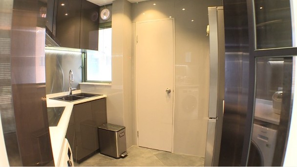 廚房採用黑白灰主調,為免過於暗沈,配上玻璃鋪牆,營造反光效果。