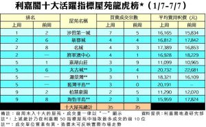 利嘉閣地產董事陳大偉表示,儘管中美貿易關係稍有緩和,惟本港的政治紛爭不斷,買家入市步伐受阻,二手交投低位徘徊。綜合利嘉閣地產分行數據所得,全港十大活躍指標屋苑在上周(1/7–7/7)錄得35宗買賣個案,與前周(24/6–30/6)的35宗相同,按周持平。