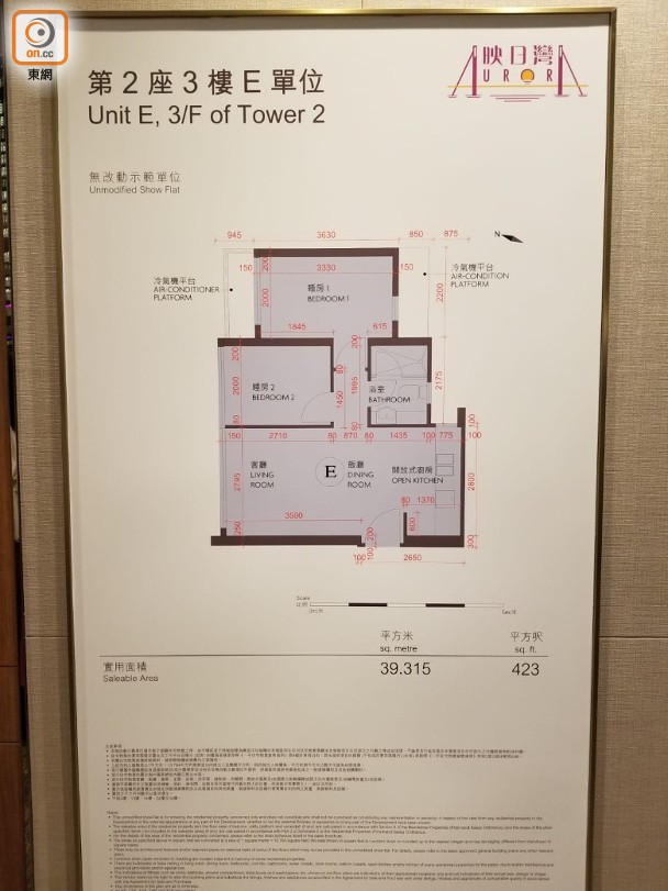 第2座3樓E室,實用面積423方呎,兩房間隔,客飯廳呈長方形設計,長約6米,寬約2.7米。