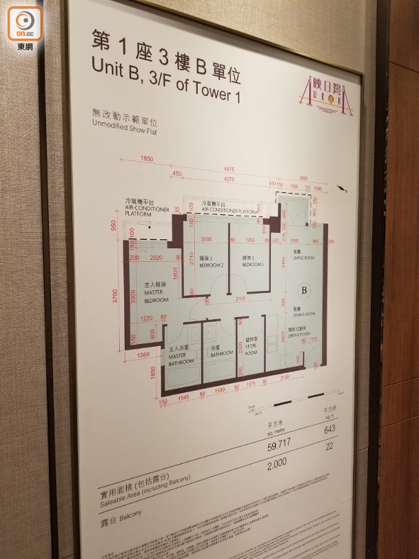 至於1座3樓B室則為三房套連儲物室設計,實用面積643方呎,大廳連接22方呎露台。