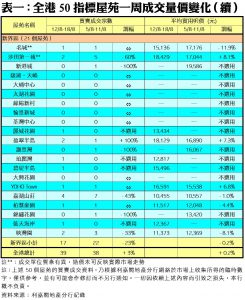 至於,新界區21個指標屋苑上周僅錄17宗買賣,按周減少23%,其中熱門上車屋苑沙田第一城,期內只錄得2宗交投,較前周的5宗大減60%;嘉湖山莊上周亦僅錄4宗買賣,按周減少43%;映灣園交投量亦按周減少33%至2宗。此外,在全港50個指標屋苑當中,上周共有23個屋苑錄得「零成交」,較前周的30個減少23%,當中九龍及新界區各佔9個及10個,港島區則佔4個(詳見表一)。