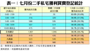 利嘉閣地產研究部主管陳海潮表示,社會運動連同中美貿易戰夾擊下,市場氣氛審慎觀望,個別平手及蝕讓個案略有增加便足以拖低二手私宅轉手獲利比率。綜合土地註冊處資料所得,2019年七月份全港1,946宗已知上手購入價的二手私宅買賣登記中,帳面獲利個案共1,907宗,佔比達98.0%,較六月的98.2%再跌0.2個百分點,連跌兩個月,創下過去6個月以來的新低。至於每宗私宅轉手的平均賺幅則逆市上升,較六月份再升0.4個百分點,報89.0%,為連續3個月錄得升幅。