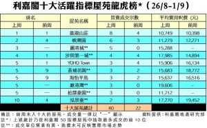 陳大偉指出,新盤銷情不俗,部分向隅客回流二手市場,加上陸續有業主擴大議價空間,吸引用家「吼位」入市,整體市況稍為喘穩,估計未來一兩周十大活躍指標屋苑交投,可維持在現水平窄幅上落。