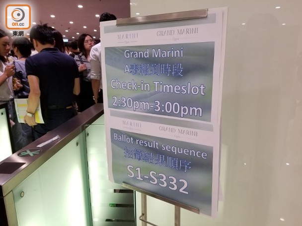據GRAND MARINI的銷售安排,發售日買家分為A組及B組兩組,A組買家最多可買4伙,該組買家最少揀選1個三房單位或揀選最少2個兩房戶。該組於下午2時半開始報到,惟2時15分已有不少準買家到場排隊等候。