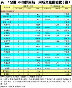 至於,九龍區21個指標屋苑上周僅錄11宗交投,按周減少31%,其中海逸豪園上周僅錄得1宗買賣,較前周的2宗減少50%;黃埔花園及新都城期內各自錄得2宗及1宗成交,分別按周無升跌。此外,在全港50個指標屋苑當中,上周共有24個屋苑錄得「零成交」,較前周的19個增加26%,當中九龍區及新界區各佔14個及8個,港島區則佔2個(詳見表一)。