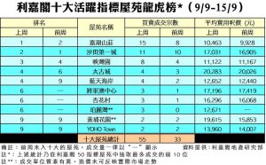 利嘉閣地產董事陳大偉表示,市場氣氛正在好轉,加上業主議價空間擴大吸引買家,二手屋苑交投量持續反彈。綜合利嘉閣地產分行數據所得,全港十大活躍指標屋苑在上周(9/9–15/9)錄得55宗買賣個案,較前周(2/9–8/9)的33宗按周大升67%。
