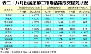 按物業價值劃分(見表一),6個組別中共有3個交投量按月向下,當中價值500萬至599萬元以及600萬元或以上的兩個組別,交投按月同樣減少32%,分別由七月份的31宗及22宗,減少至上月只有21宗及15宗。按屋苑劃分(見表二),八月份天水圍天盛苑及天頌苑同錄6宗買賣,涉及總值分別約2,746.8萬及2,459.0萬元,齊齊成為上月最熱賣屋苑。