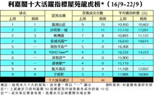 利嘉閣地產董事陳大偉表示,現時二手業主普遍願意減價,加上整體市場氣氛大致穩定,吸引觀望已久的資金重新流入。綜合利嘉閣地產分行數據所得,全港十大活躍指標屋苑在上周(16/9–22/9)錄得53宗買賣個案,較前周(9/9–15/9)的44宗按周上升20%。