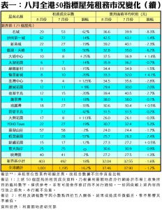 陳海潮指出,受社會運動、中美貿易戰及香港評級被降等多個不利因素先後困擾下,樓價於八月份顯著下跌2.6%,租金亦同樣受累而罕有地在八月份回落。踏入九月份真正旺季結束,加上社會運動未見平息,料租金將持續受壓;預期50指標屋苑租金在九月份將橫行或續有0.5%以內的輕微跌幅,而租賃宗數亦有機會跌破千宗水平,料跌5%至10%,處於900宗至950宗的水平徘徊。