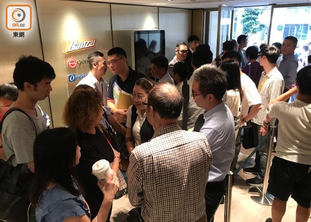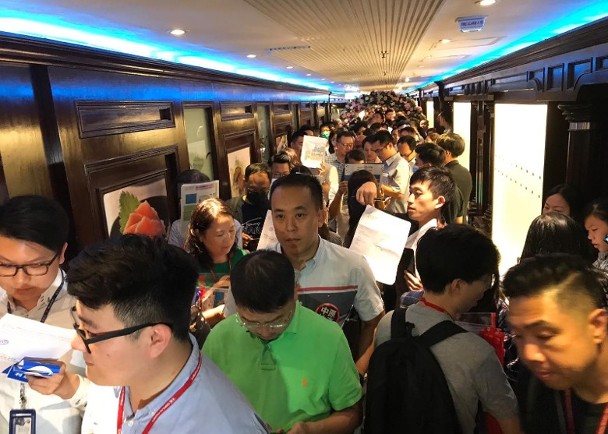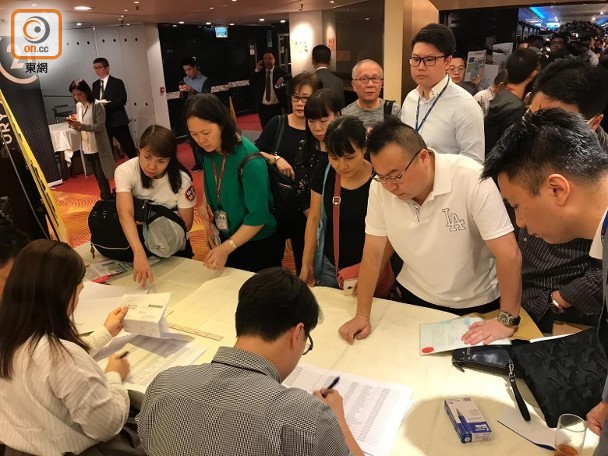 B組買家則由下午2時至2時半報到,發展商特別租用售樓處所在商場的酒樓,用作買家登記及等候區,現場氣氛熱鬧,擠滿大批準買家等候。