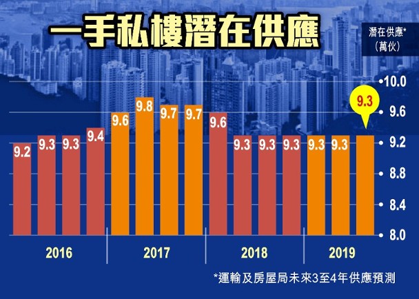 運輸及房屋局公布,截至9月底,未來3至4年一手私人住宅單位數量續維持在9.3萬伙,連續6季不變。當中包括1萬個貨尾單位,6萬伙興建中但未售出單位,以及2.3萬個在已批出土地(熟地)上可隨時動工興建的單位。