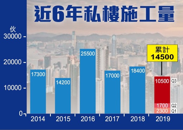 首三季累計,私人住宅施工量1.45萬伙,按年少1,900伙或11.58%。已落成量為1.01萬伙,按年減少2,500伙或19.84%。