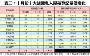 此外,上月十大活躍二手私人屋苑登記量全線錄得上升,當中升幅最大者為荃灣中心,月內共有18宗登記,較九月份的6宗急升2倍;其次太古城及黃埔花園亦分別升1.83倍及1.27倍,各錄17宗及25宗登記。至於嘉湖山莊續以43宗之數,蟬聯上月最熱賣屋苑,按月亦升59%。