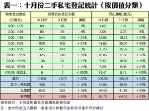 今年十月份,按二手私宅價值分類,9個價格組別的買賣登記量錄得6升3跌,當中1億元或以上組別的登記量由九月的2宗大增2倍,至十月份的6宗,成為增幅最大的組別;而2,000萬至5,000萬元以內及1,000萬至2,000萬元以內兩個組別亦分別升77%及35%。至於,成交佔比最多者,介乎500萬至700萬元以內組別亦升37%,錄得826宗登記;反之,介乎700萬至1,000萬元以內者則逆市跌3%,至427宗。