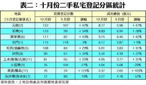 按全港三區作分析,十月份港九新界三區登記量全線上升。當中,以新界區升幅最顯著,月內共錄1,311宗登記,按月升31%。宗數最少的港島區也有10%的升幅,共錄得458宗登記;而九龍區則錄得640宗登記,按月升16%。另外,十大最活躍成交分區登記量則七升三跌,當中以東涌/離島區的升幅最大,月內錄76宗登記,按月大升1.24倍;其次為將軍澳區,按月升約43%,有117宗登記。至於元朗區則為買賣登記最旺的分區,上月共錄得152宗,按月也升42%。