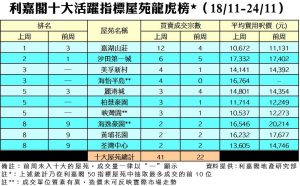 利嘉閣地產董事陳大偉表示,二手業主態度強硬,買家入市意欲欠缺積極,屋苑交投持續淡靜。綜合利嘉閣地產分行數據所得,全港十大活躍指標屋苑在上周(18/11–24/11)錄得41宗買賣個案,雖較前周(11/11–17/11)的22宗按周增加86%,但平均每個屋苑只有約4宗成交,交投未算活躍。