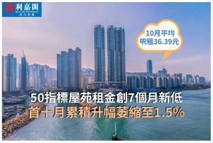 利嘉閣地產研究部主管陳海潮表示,租賃淡季兼逢早前社會運動趨嚴重,影響住宅租賃市場表現;加上當局放寬首置按保限制,刺激部分用家轉租為買,租賃市場可謂雪上加霜。綜合利嘉閣地產研究部數據所得,2019年十月份全港50個指標屋苑的加權平均實用呎租報36.39元,較九月份的36.75元再跌1.0%,連跌三個月並創七個月新低,至於今年首十個月租金累計升幅亦進一步收窄至約1.5%。