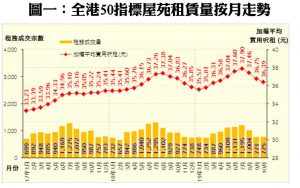 陳海潮指出,社會運動致使部分大學提早結束學期,更有內地學生出現退租的情況,令租賃市場更見淡靜。此外,《施政報告》放寬首置客的按保限制,令部分計劃租樓的用家轉至買賣市場尋寶,情況料在十一及十二月將有更明顯反映。受上述因素影響,預期十一月份50指標屋苑租賃宗數維持在700餘宗的低水平窄幅上落,而估計租金亦會持續受壓,跌幅料介乎0.5%至1%之間,進一步下試36元邊緣。