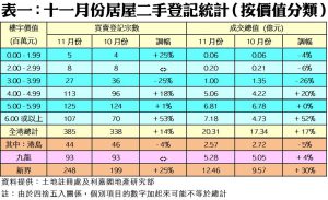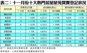 如按屋苑細分(見表二),九龍灣麗晶花園上月成交錄得15宗登記,較十月份10宗成交按月增加50%,期內成交總值增加42%至約8,109.0萬元,成為上月最熱賣屋苑首位。