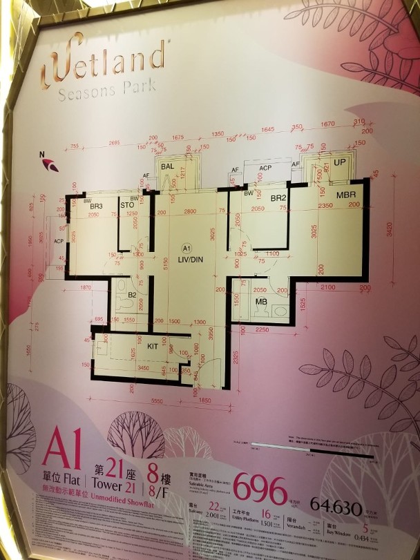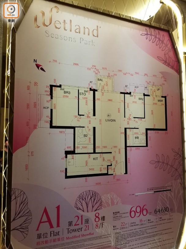 新鴻基地產(00016)旗下天水圍Wetland Seasons Park周四(26日)開放三個示範單位予傳媒參觀。其中第21座8樓A1室示範單位,設有連裝修單位及交樓標準單位,實用面積696方呎,採用三房間隔。