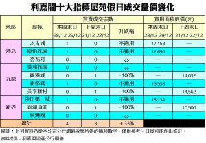 《利嘉閣十大指標屋苑假日二手實況》 節日氣氛濃厚 二手交投持續淡靜 十大屋苑周末錄4宗買賣 按周回升一宗