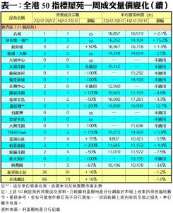 至於,九龍區21個指標屋苑上周累錄35宗買賣,按周增加1宗或3%,其中都會駅及港灣豪庭分別錄得3宗成交,各自較上周的1宗大增2倍;新都城及將軍澳中心則雙雙錄得5宗成交,按周增幅分別達1.5倍;譽‧港灣亦錄得2宗交投,較前周的1宗增加1倍。此外,在全港50個指標屋苑當中,上周共有13個屋苑錄得「零成交」,較前周的12個增加8%,當中九龍區及新界區各佔5個及7個,港島區則佔1個(詳見表一)。