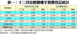 至於非住宅市場方面,在店舖買賣進一步急跌,加上純車位登記亦持續大減下,成為十二月份交投量最少的樓宇買賣類別,比一手私宅的六百餘宗再少近15%。其中工、商、舖三大範疇中,以店舖表現最差,按月跌幅近四成;至於純車位及其他類別物業,登記量亦挫至三百餘宗邊緣。總計十二月份整體工商舖及其他物業登記量按月跌28%,錄553宗;涉及登記金額同挫28%,全月合共只有41.07億元。