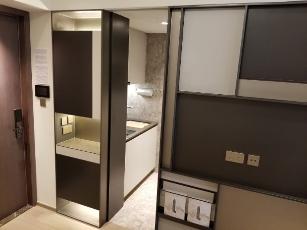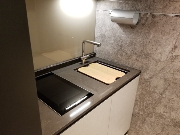 該盤今日(2日)開放一個交樓標準示範單位予傳媒參觀,單位為8樓D室,實用面積213方呎,屬開放式戶。他表示,集團與意大利傢俬品牌合作,擬向項目開放式單位業主,提供以優惠價換購變形傢俱,該類傢具可作多功能枱或睡床,床架採用安全鎖設計。
