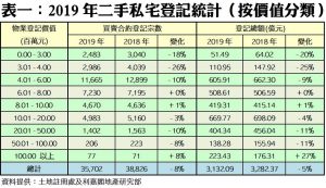 按物業價格劃分,在9個價格組別的登記量當中,600萬元以下的3個細價組別全部報跌(見表二),其中以價值301萬至400萬元者跌幅最顯著,僅錄得2,986宗登記,按年急跌26%。至於2019年登記量佔比最多的是介乎401萬至600萬元的組別,共錄得11,665宗登記,惟按年亦跌10%。反之,介乎601萬至800萬元及801萬至1,000萬元的兩個組別則錄得輕微升幅,相信與當局放寬按保限制而產生刺激作用有關。此外,1億元以上的價格組別買賣登記量亦增加8%,全年共錄77宗。