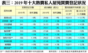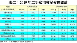 按地區觀察,2019年分區熱賣的三甲排名依次是將軍澳(2,110宗)、元朗(1,873宗)及旺角/油麻地(1,696宗)。當中將軍澳區更是去年升幅最突出者,較2018年的1,930宗增加9%,排名亦由前年的第三位升至去年的第一位。反之,榜內按年錄得較大跌幅的地區為土瓜灣及長沙灣/深水埗兩區,同跌逾兩成,全年分別只有1,336宗及1,317宗登記(見表二)。