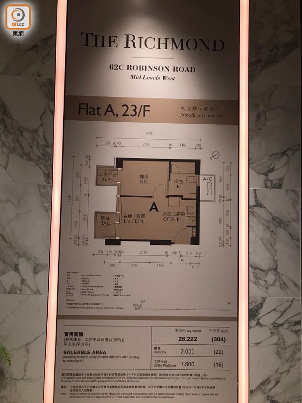 恒基地產(00012)旗下西半山羅便臣道THE RICHMOND首度開放交樓標準示範單位予傳媒參觀。單位參照23樓A室搭建,實用面積304方呎,間隔為一房設計,廚房屬開放式,大廳連接面積22方呎露台,睡房則設有16方呎工作平台。