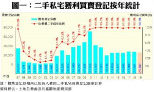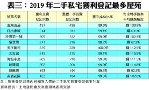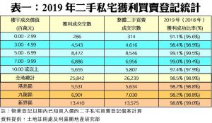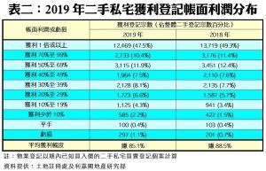 值得特別注意的是,隨著樓市在去年下半年轉冷,沽樓獲利1倍或以上的轉手個案佔整體二手私宅買賣比例頓見回落,數字更由2018年的49.3%,按年減少1.8個百分點至2019年的47.5%(見表二),但仍是佔比最多的賺幅分類,共涉及12,469宗。至於去年錄得虧損的登記有297宗,佔比由2018年的0.7%增至2019年的1.1%。
