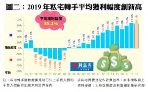 利嘉閣地產研究部主管陳海潮表示,2019年樓市面對中美貿易戰及社會運動雙重挑戰,令下半年樓價明顯受壓,拖累轉手獲利比率及平均每宗賺幅出現回落。綜合土地註冊處資料所得,2019年全港26,239宗已知上手購入價的二手私宅買賣登記中,帳面獲利個案共25,842宗,佔比達98.5%,較2018年的98.9%減少0.4個百分點,為之前連升兩年後,再度回落,惟在過去9年維持在高水平窄幅橫行。至於每宗私宅轉手平均賺幅亦略見回落,錄得85.1%,較2018年歷史高位的88.5%,按年跌3.4個百分點,但仍屬歷史次高。